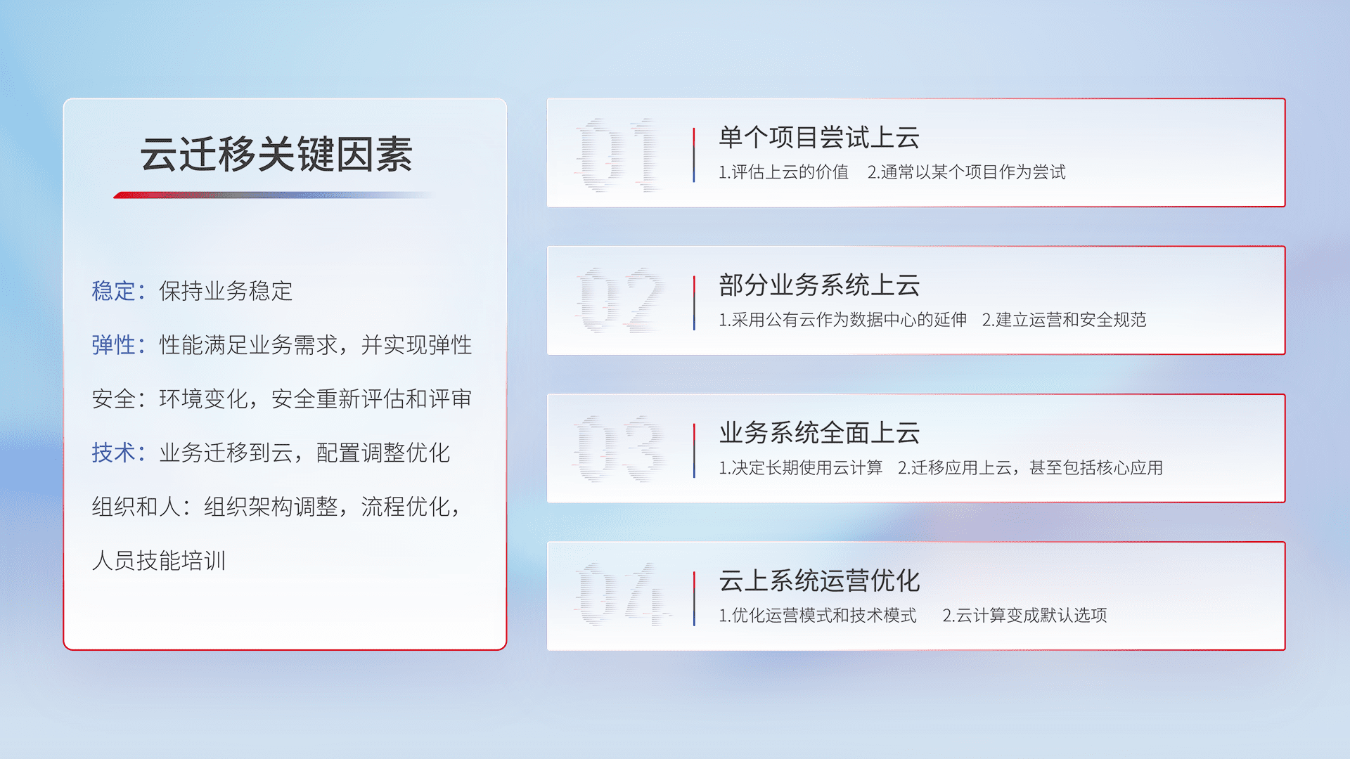 结合实际业务,,,从规划设计、、云平台选型、、、云原生改造、、、数据迁移、、集成交付,,迁移全过程为客户识别最佳上云路径,,,,做好风险识别管理,,设计网络架构、、、、身份权限、、、、安全审计合规、、、操作审计、、日志审计、、、、监控告警策略、、、多站点容灾设计等,,,,对云上基础设施进行整体规划,,,提升IT治理水平,,,以满足弹性、、高可用、、、、高性能的需求。。